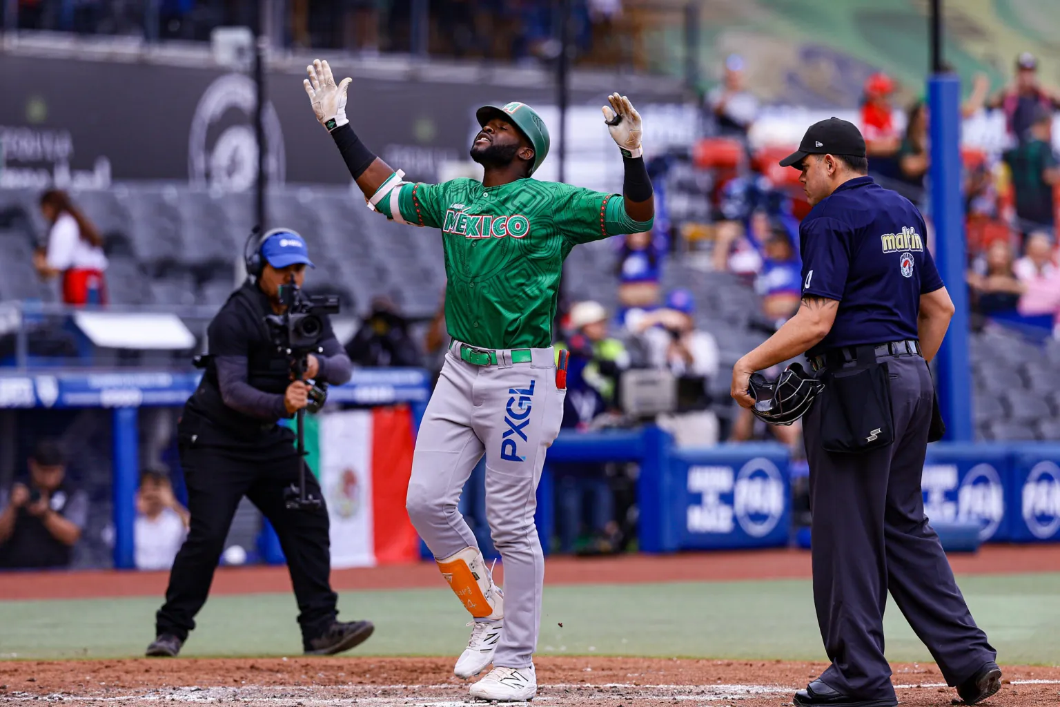 En el cuarto episodio, tras dos outs, Víctor Mendoza conectó sencillo al jardín derecho y Luis Verdugo recibió boleto. El dirigente de los Leones sustituyó a De la Cruz por Kenny Hernández, quien permitió el cuadrangular de Florial que dio ventaja 3-2 a México Verde.