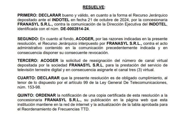La resolución del Indotel dice que acoge como bueno y válido el recurso sometido por la empresa: