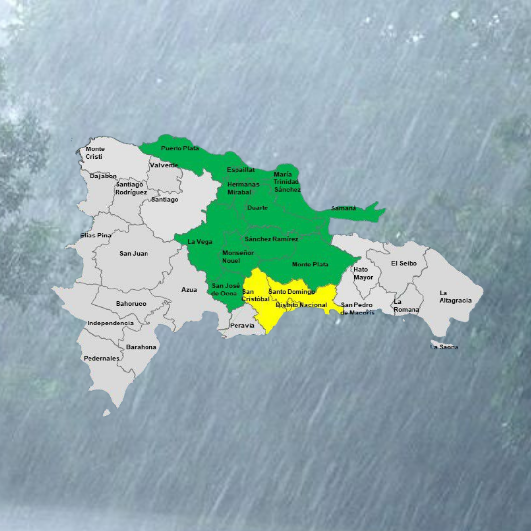 En virtud de lo anterior el COE declara en los diferentes niveles de alerta ante posibles crecidas de ríos, arroyos y cañadas, así como inundaciones repentinas o urbanas, a San Cristóbal, Prov. Santo Domingo y Distrito Nacional en alerta amarilla, mientras que Monseñor Nouel, Monte Plata, María Trinidad Sánchez, Duarte, Samaná, San José de Ocoa, Hermanas Mirabal, La Vega, Sánchez Ramírez, Espaillat y Puerto Plata están bajo alerta verde.