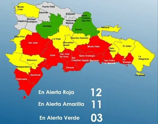 Mientras que en alerta amarilla figuran: La Vega, Samaná, Hato Mayor, El Seibo, Bahoruco, Monseñor Nouel, Sánchez Ramírez, Monte Cristi, Elías Piña, Independencia y La Altagracia.