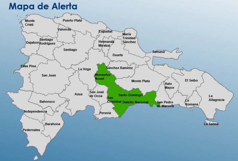 Las provincias en alerta verde son: San Cristóbal Santo Domingo Monseñor Nouel Distrito Nacional En ese sentido, se recomienda abstenerse de cruzar ríos, arroyos y cañadas que presenten alto volúmenes de agua y no hacer uso de balnearios en las provincias bajo alerta.