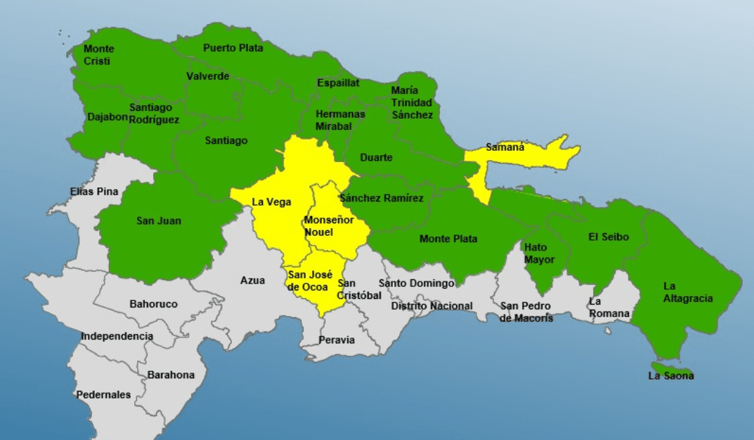 En alerta verde están Sánchez Ramírez, Puerto Plata, Espaillat, Valverde, San Juan, Hermanas Mirabal, Santiago Rodríguez, Santiago, María Trinidad Sánchez, Monte Cristi, Duarte, La Altagracia, Dajabón, Seibo, Hato Mayor y Monte Plata.