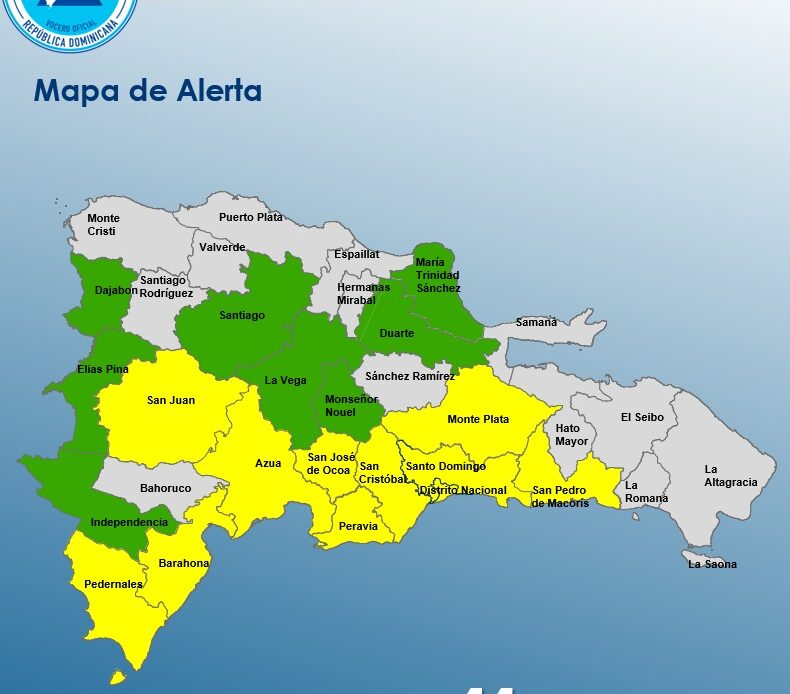 SANTO DOMINGO: Se mantienen 11 provincias en alerta amarilla y 8 en alerta verde, por posibles inundaciones repentinas urbanas y rurales, crecidas de ríos, arroyos y cañadas, así como por eventuales deslizamientos de tierra.