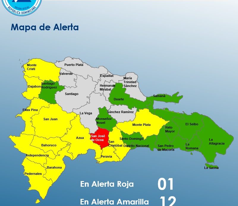 Según el más reciente mapa de alerta, San José de Ocoa continúa en alerta roja, mientras que provincias como Monte Cristi, Dajabón, San Juan, Azua, Barahona, Bahoruco y Pedernales se mantienen en alerta amarilla, y otras como La Altagracia, El Seibo, Samaná y Duarte figuran en alerta verde.