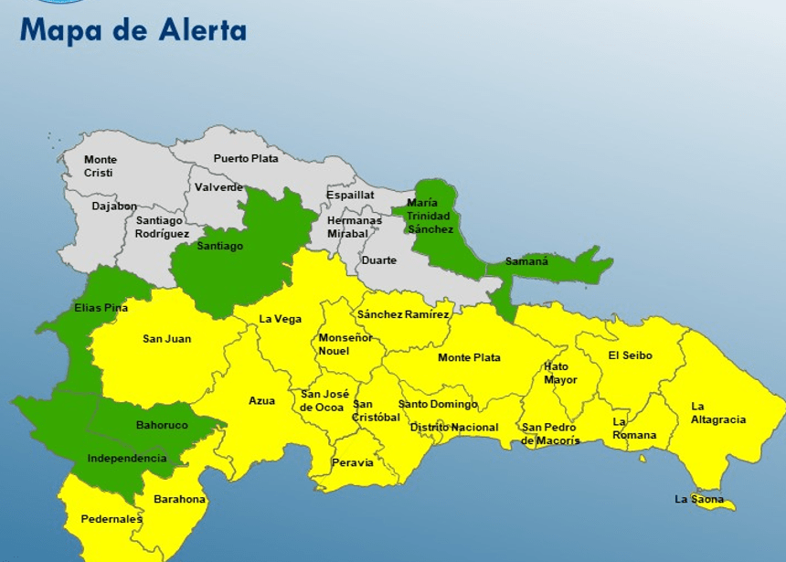 En tanto, en alerta verde se encuentran María Trinidad Sánchez, Bahoruco, Samaná, Santiago, Independencia y Elías Piña.