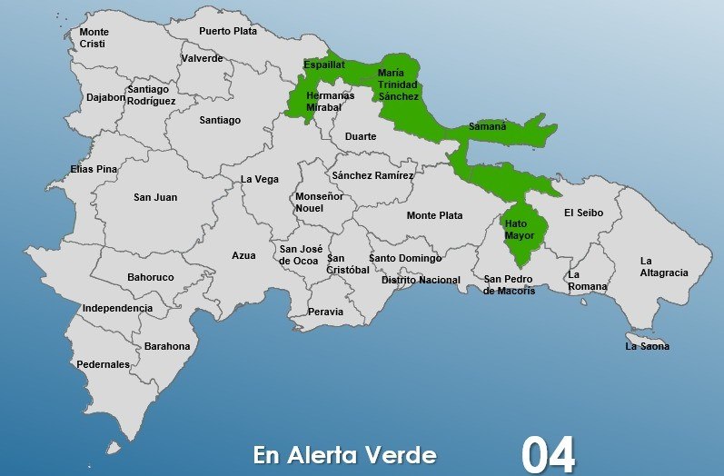 Las provincias bajo alerta verde son Espaillat, María Trinidad Sánchez, Samaná y Hato Mayor. En tanto, el organismo descontinuó el nivel de alerta para Hermanas Mirabal y Duarte, tras una mejoría en las condiciones meteorológicas en esas demarcaciones.