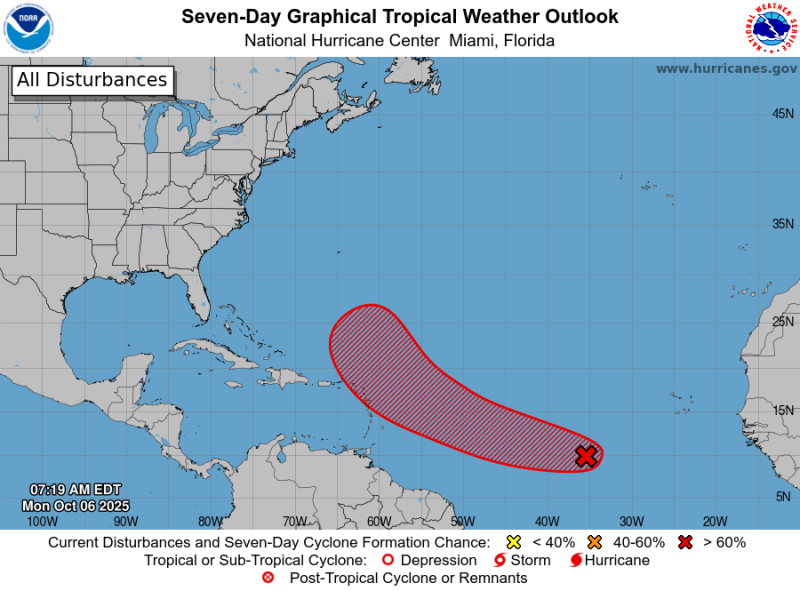 SANTO DOMINGO: El Instituto Dominicano de Meteorología (Indomet) informó este lunes que mantiene vigilancia sobre una zona de baja presión ubicada a varios cientos de kilómetros al suroeste de las islas de Cabo Verde, con un 50 % de probabilidad de convertirse en ciclón tropical en los próximos dos días.