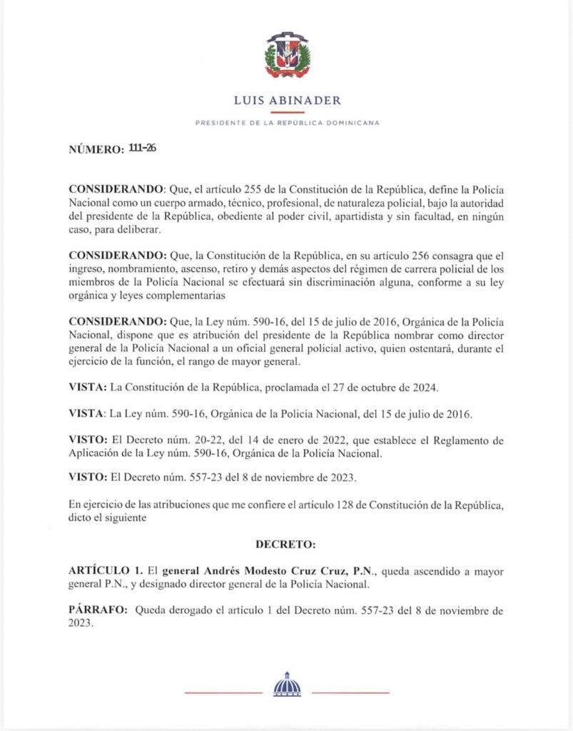 SANTO DOMINGO: El presidente de la República, Luis Abinader, ascendió al general Andrés Modesto Cruz Cruz al rango de mayor general y lo designó director general de la Policía Nacional de la República Dominicana mediante el Decreto núm. 111-26.