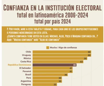 SANTO DOMINGO: El informe de Latinobarómetro 2006-2024 sitúa a la Junta Central Electoral (JCE) de República Dominicana como la quinta institución electoral de la región en donde hay más confianza y la sexta entre los que piensan que las elecciones son limpias.